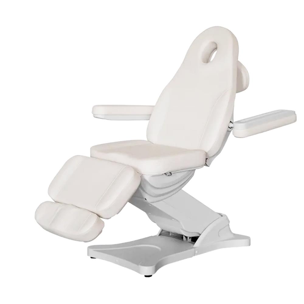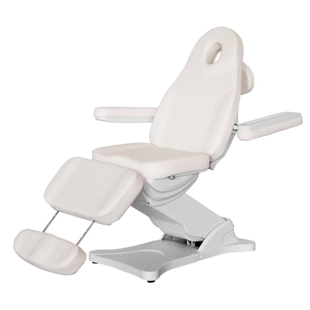 Three-section aesthetic bed with very stable structure, ideal for beauty and wellness centers. Equipped with 3 motors that adjust the height, the backrest incline, and the footrest. Folding and removable armrests for easier access. Includes headrest with face hole and cushion for greater client comfort. Upholstered in high-quality white PU, durable and easy to clean.