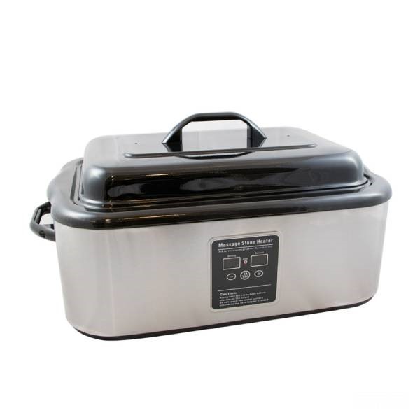 Big digital hot stone heater for massage therapy. It keeps a constant temperature between 40C and 50C. Slotted spoon included.