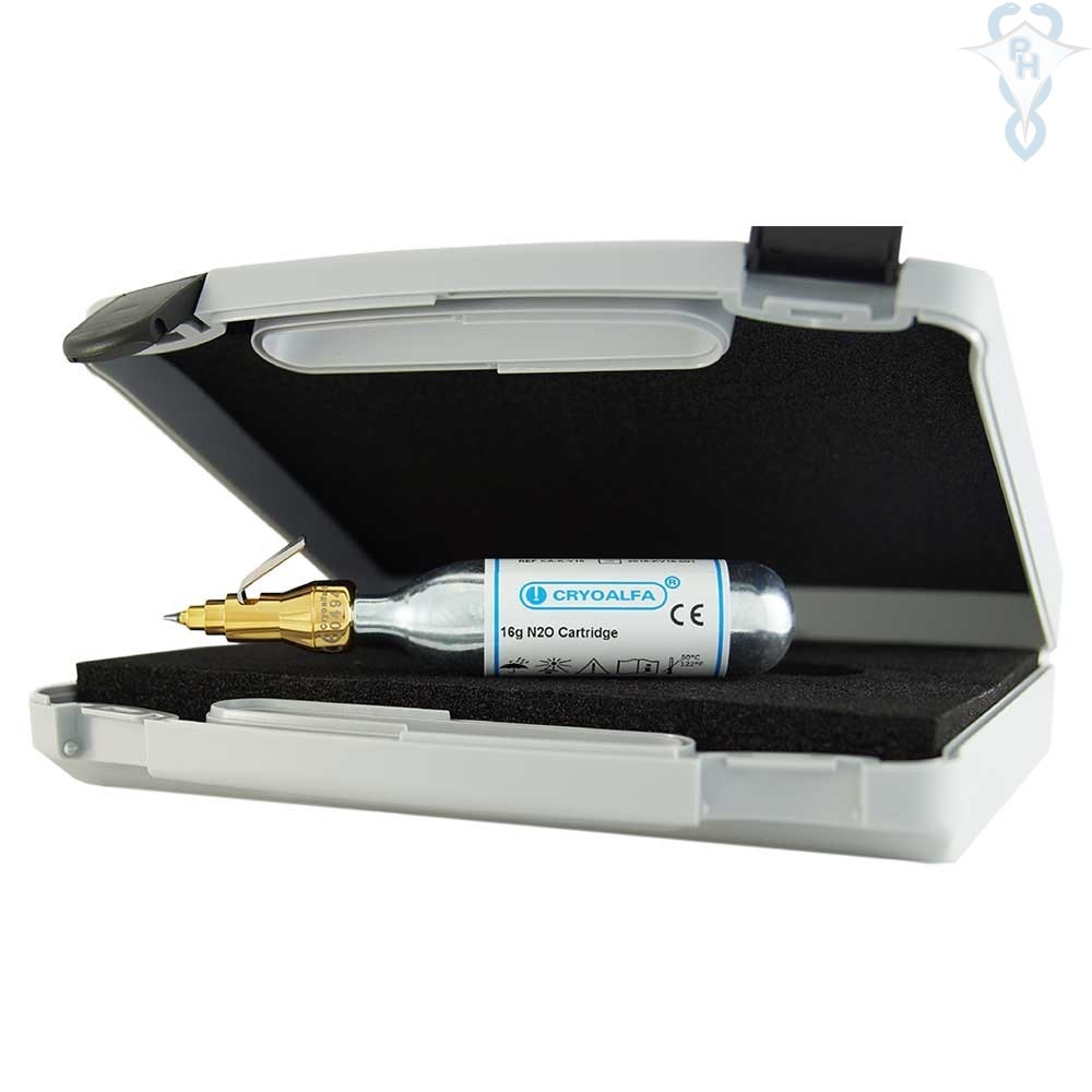 Treatment with a Cryo Super unit is mostly painless and therefore highly suitable for treating children. The micro 1mm glass tip provides very accurate and effective therapy. In many cases, a single treatment is sufficient. The Cryoalfa Super is supplied with a 16gr Nitrous oxide gas cartridge in a high impact case making it highly portable for treatment in medical practices as well as for home visits by the doctor or podiatrist.