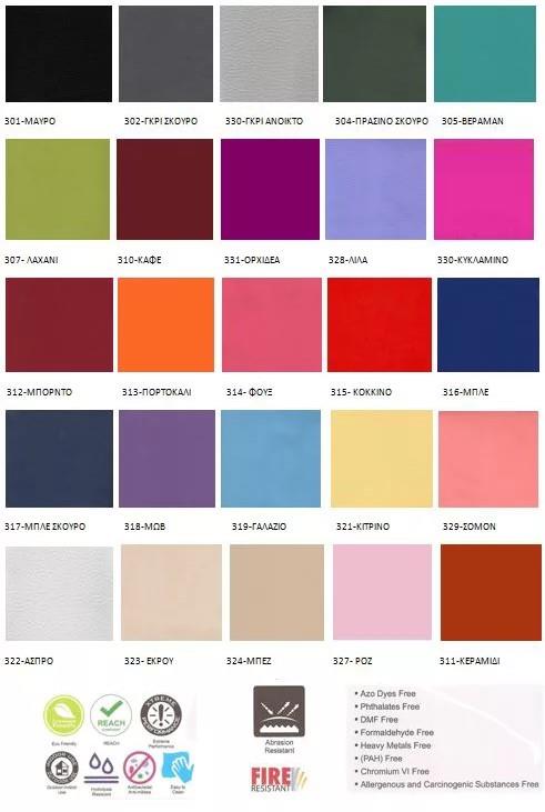 Coating with high quality synthetic leather from flame retardant material in a variety of colors.