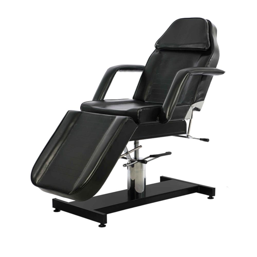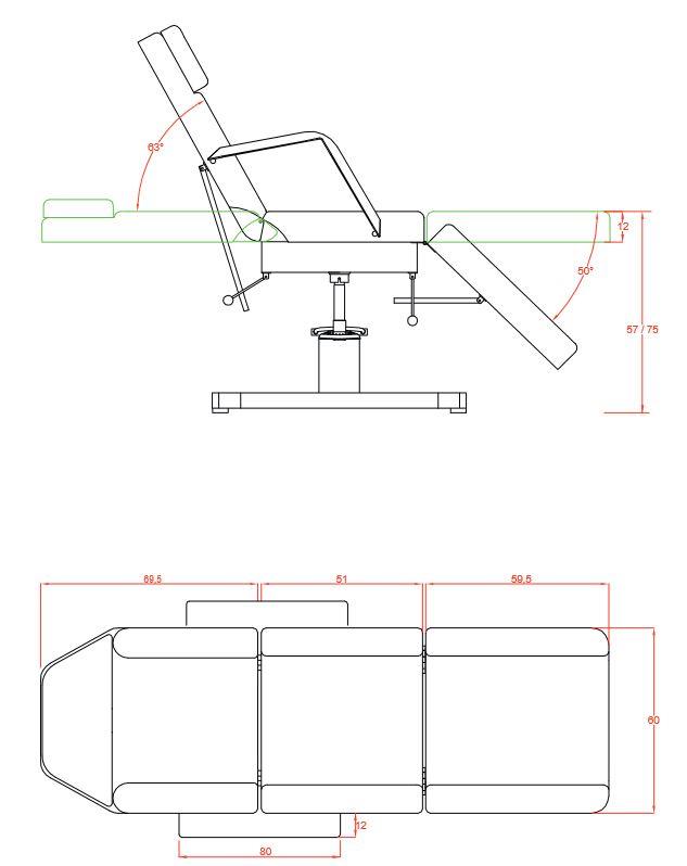 Functional 3-section chair with a painted metallic frame, equipped with a hydraulic pump that controls height. Backrest and legrest inclination is manually adjustable. Removable armrests. Easy-to-clean PVC upholstery.