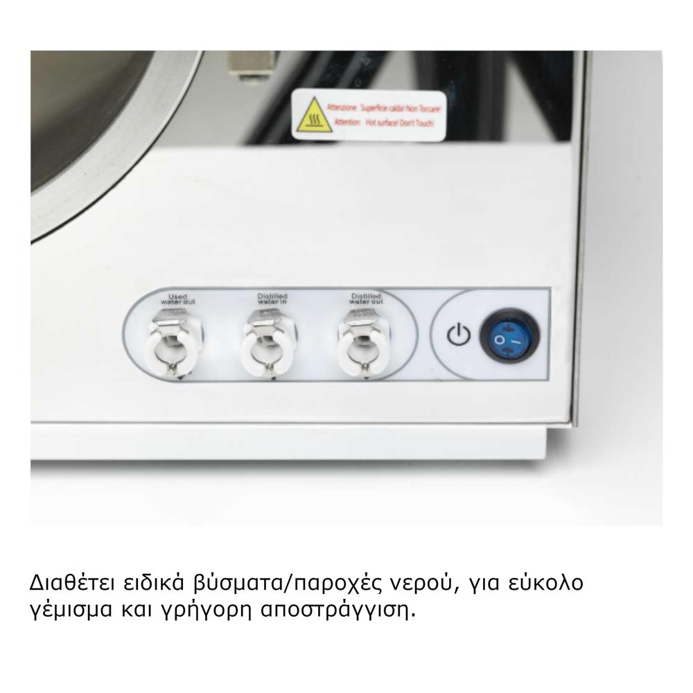 - Internal circuit washing cycle: The washing cycle of the internal circuits extends the life of the autoclave, reducing the need for technical interventions. No chemical additives, only distilled water from the stainless-steel clean water tank, in just 4 minutes!