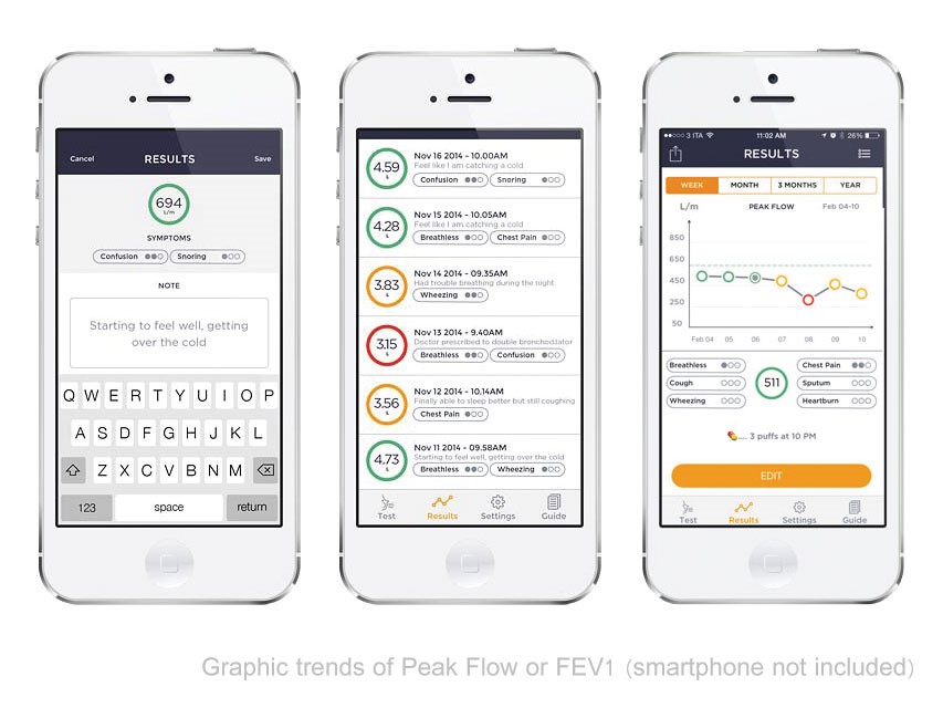 Με ιστορικό αποτελεσμάτων του Peak Flow, ενδεικτικές λυχνίες για την κατάσταση της υγείας, βαθμολογία συμπτωμάτων και δυνατότητα σημειώσεων.