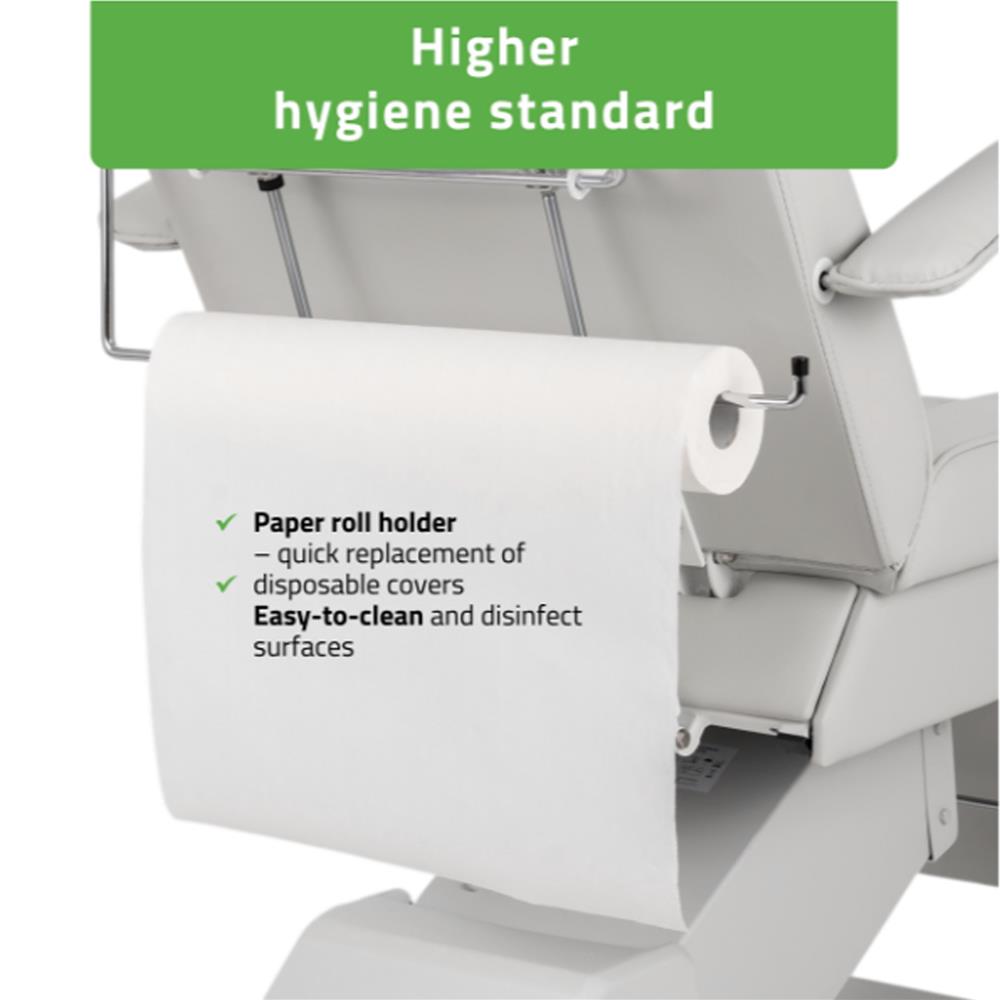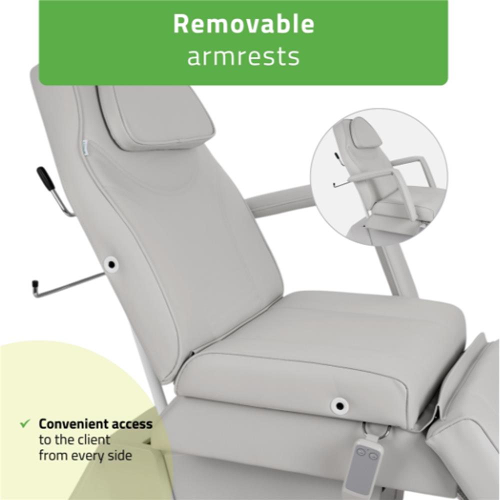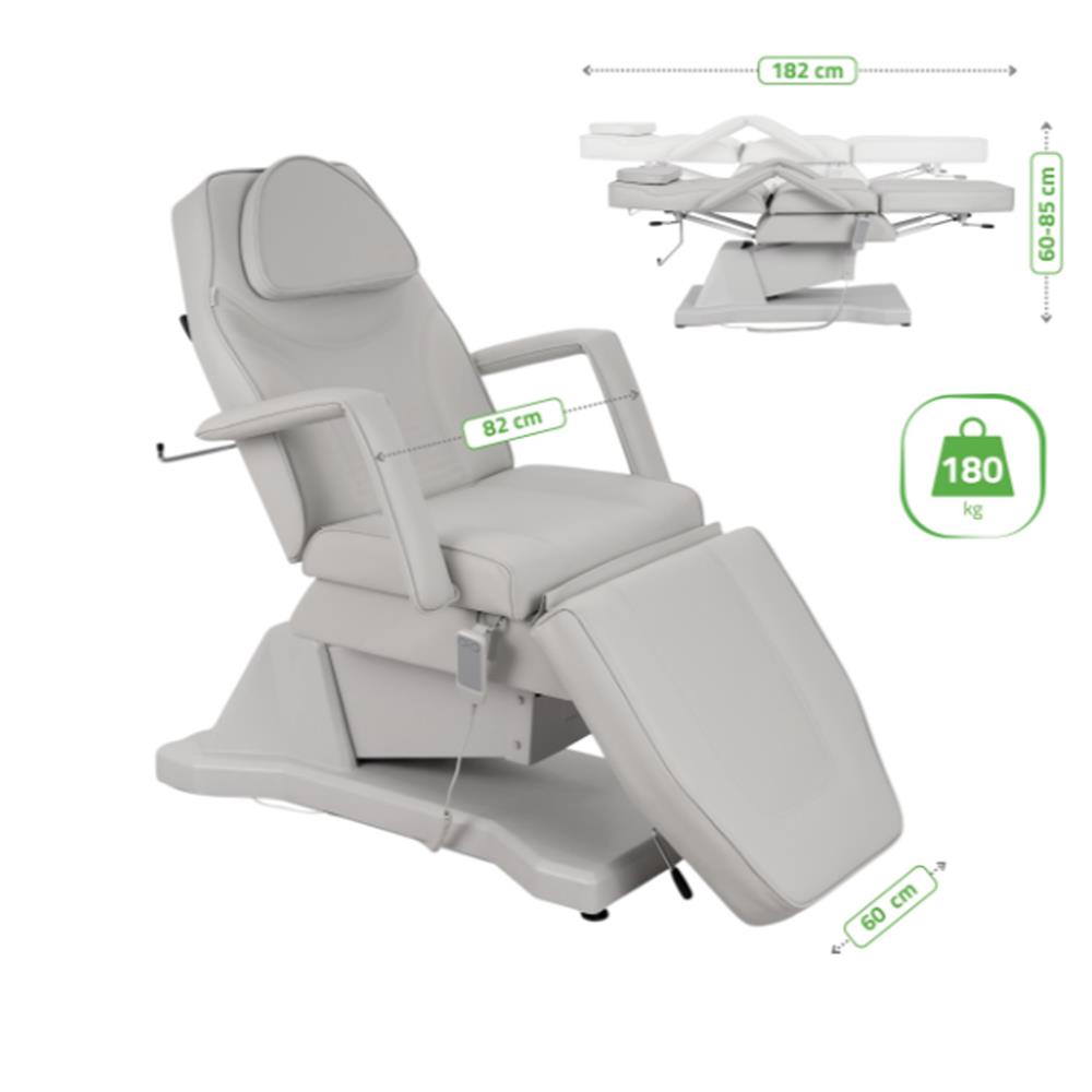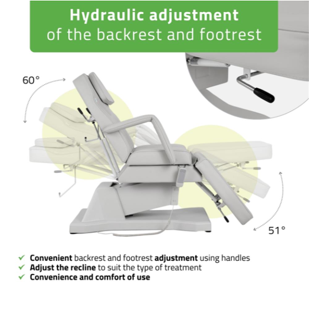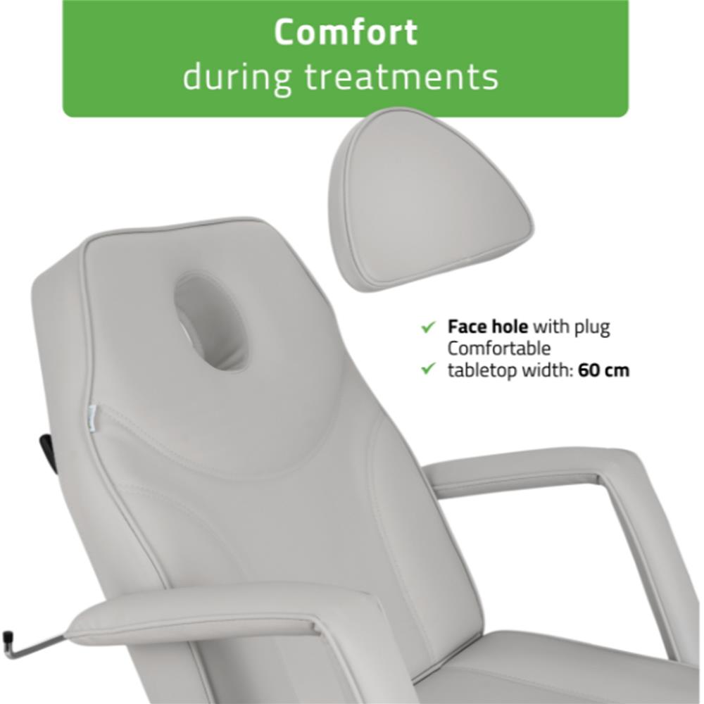 - Ρυθμιζόμενες θέσεις: Δυνατότητα προσαρμογής της πλάτης και του υποποδίου για την ιδανική τοποθέτηση του πελάτη ανάλογα με τη θεραπεία.